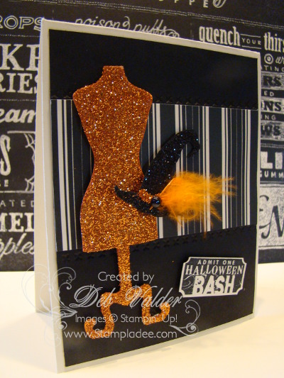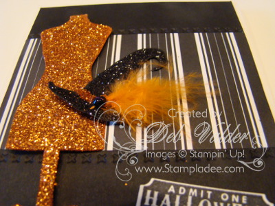 Just above and below the Modern Medley piece run the Needlepoint Embossing Folder.    With the Big Shot, cut out a dress form from any scrap piece of paper.  Cover the dress form with Versa Mark and Heat and Stick powder then the Orange Glitter (see video below on how to use the Heat and Stick Powder).  Next stamp the hat from the Best of Halloween stamp set with Versa Mark, add your Heat and Stick Powder then add your black glitter and re-heat.  Cut out and add a strip of Mulitpurpose Tombow Glue to the hat and adhere the orange glitter (for the band).  I also added an orange feather and a rhinestone that was painted with a black Sharpie Marker.  Stamp the words from the Halloween Bash stamp set and punch out with the Ticket Duo Builder Punch.  Pop that onto your card and you are DONE!  The card is so much more sparkly in person than it is in the pictures…So much fun!