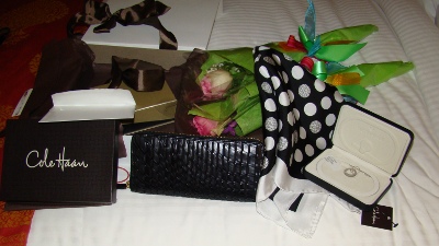 Here are some of the gifts they gave me besides the FREE STAMPS!  Oh my gosh, I don't even know who Cole Haan is but I got his scarf and purse!  There is another diamond necklace and MORE FREE STAMPS!  :0)  Are you understanding why I had to ship this stuff home?  NO ROOM IN THE THREE SUITCASES I HAD!