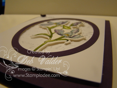 Take the outside piece of Whisper White card stock and cut out the larger oval. Stamp the saying from the Six-Sided Sampler on the upper left corner (I added a flower and pearl also), this can now be popped onto the card over the Pretty Print Textured piece.