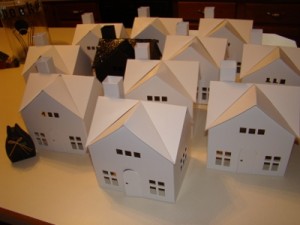 but did you ever hear of the "black house of the neighborhood"? Here are the houses after I put them together and before they were spray painted by Kevin, ready for the class on Saturday.